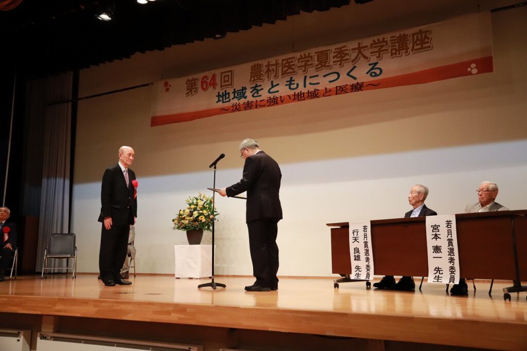 開講式に続いて行われた若月賞授賞式では、地域医療に多大な貢献をされた3名の先生方が表彰され、それぞれの分野での取り組みについて講演が行われました。熊本学園大学教授の中地重晴氏は、有害化学物質による環境汚染と健康被害に対する市民の環境監視活動について語り、環境安全の重要性を訴えました。鹿児島大学名誉教授の田中信行氏は、リハビリテーション医学と温泉・温熱療法の研究成果を紹介し、地域医療との連携の可能性を示しました。信州大学名誉教授で相澤病院の清澤研道氏は、戦後の医療の課題としてC型肝炎の歴史を振り返り、患者に寄り添う医療の必要性を強調されました。